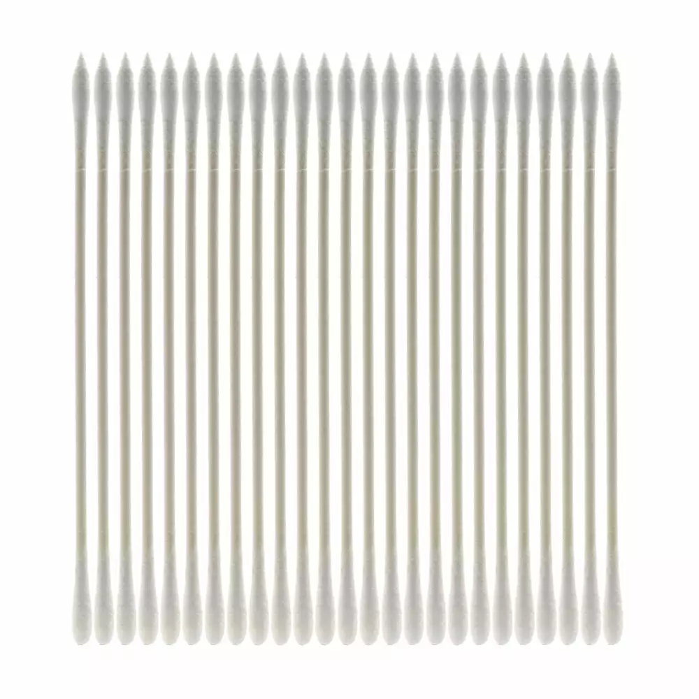 With a pointed tip on one end and a rounded tip on the other, this dual ended mini precision swab with paper handle is ideal for reaching small areas during makeup application.