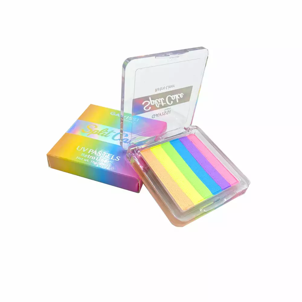 Create beautiful rainbow gradients with our 6-color split cake liners! Ideal to use as graphic liner, face, and body art. All 6 colors are UV reactive and they glow under UV lamp/blacklight.