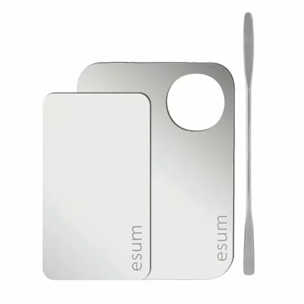 Esum’s Pro Palette and Spatula Set is a kit essential! Prep and mix all your mediums on the stainless steel surface with the dual-ended spatula. Includes thumb hole for easy gripping.