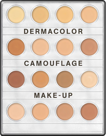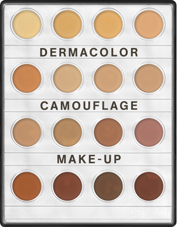 Dermacolor Camouflage Creme in Kryolan classy, mini palette with 16 colors is ideal for professional use. Dermacolor Camouflage Creme is an especially highly pigmented make up which is designed to correct and cover skin disfigurements, discolorations and tattoos. Dermacolor Camouflage Creme is especially suitable for face and neck. With proper use of the Dermacolor Camouflage System skin abnormalities can be easily corrected.